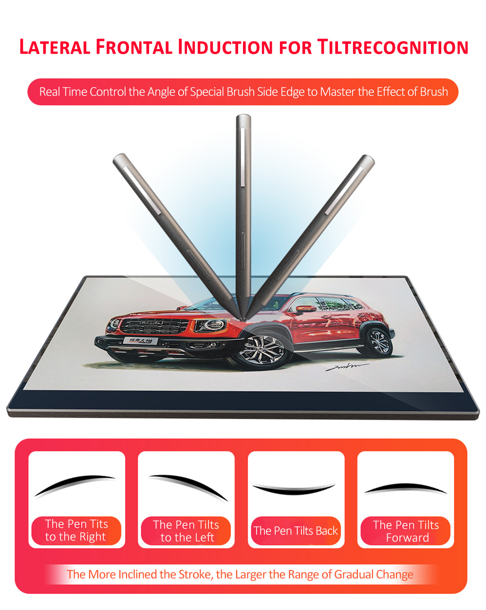 LATERAL FRONTAL INDUCTION FOR TILT RECOGNITION Real Time Control the Angle of Special Brush Side Edge to Master the Effect of Brush.The More Inclined the Stroke, the Larger the Range of Gradual Change:The Pen Tits to the Right / The Pen Tilts to the Left / The Pen Tits Back / The Pen Tilts Forward |