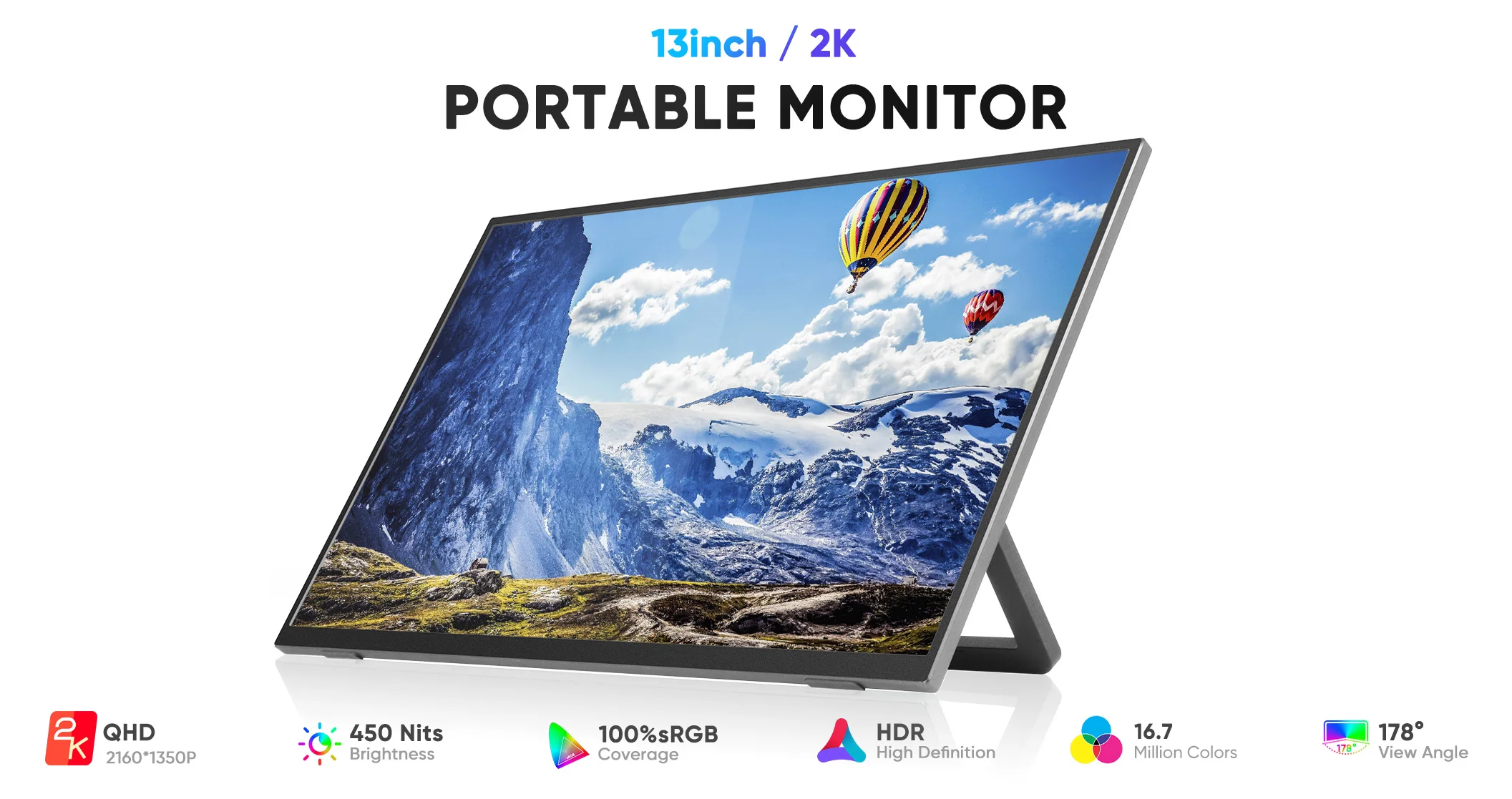 Portable Monitor for Laptop 13.0 inch 2K IPS Eye Care Screen with Stand 180 Adjustable Dual Speaker Travel Monitor